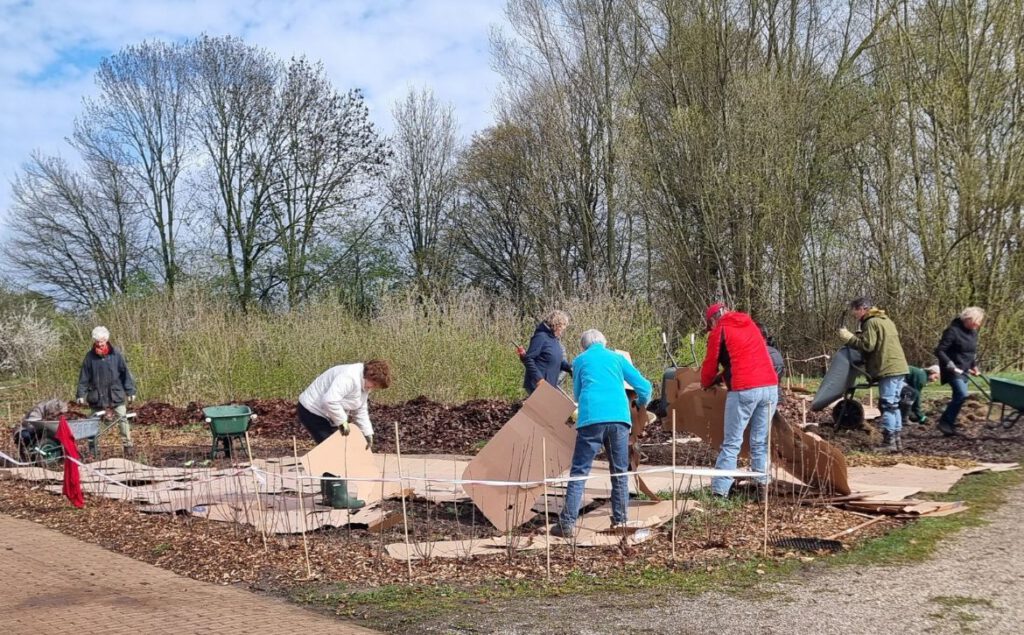 Daarna grote lappen karton erop – wat nog een hele kunst was met die wind – en dan maar kruien. In file reden de vrijwilligers met kruiwagens af en aan en werd het karton steeds verder bedekt met goede aarde en wormenmest. Intussen werd met de graspollen die er nog lagen een “kruidenheuvel” gebouwd, een variant op de kruidenspiraal. Tenslotte werd het blad, met de verschrikte wormen, weer teruggelegd op de zwarte aarde, om uitdrogen te voorkomen.